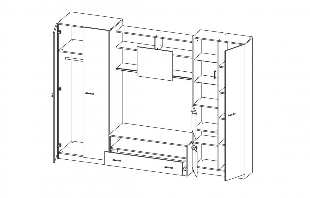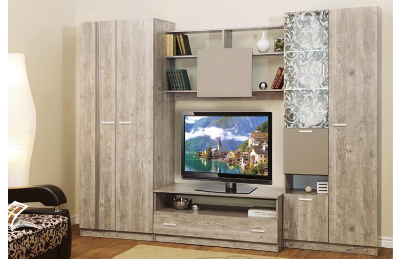 обладает оригинальным дизайном, модной расцветкой и грамотно продуманной конструкцией. Слева имеется большой двухстворчатый шкаф с антресольной полкой и штангой для вешалок. Справа предусмотрен комбинированный шкаф, имеющий два отсека с откидными дверцами, большой отдел с глухой створкой и отсек со стеклянной витриной, декорированной красивым рисунком. Тумба под TV имеет открытую нишу, подходящую для размещения видеоаппаратуры, и закрытую полку с глухим фасадом. Центральная верхняя часть оборудована полками для книг и сувениров.