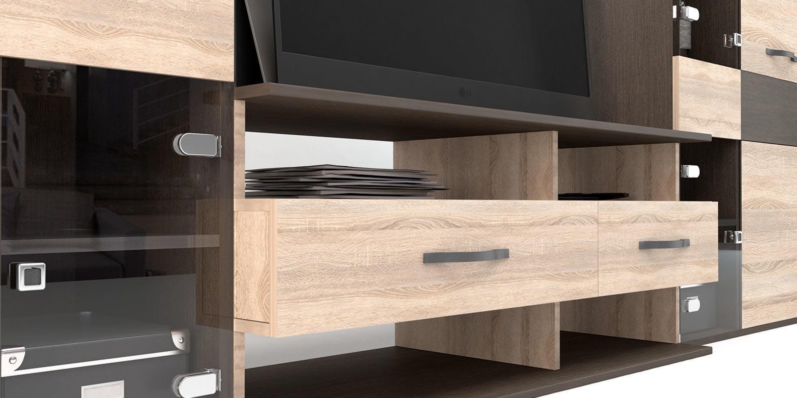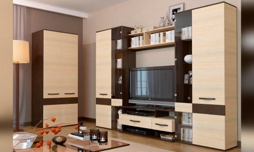 Наполнение: Полка закрытая — 20 шт. Полка открытая — 2 шт. Ниша открытая — 4 шт. Выдвижной ящик — 2 шт. Ниша для телевизора — 1 шт.