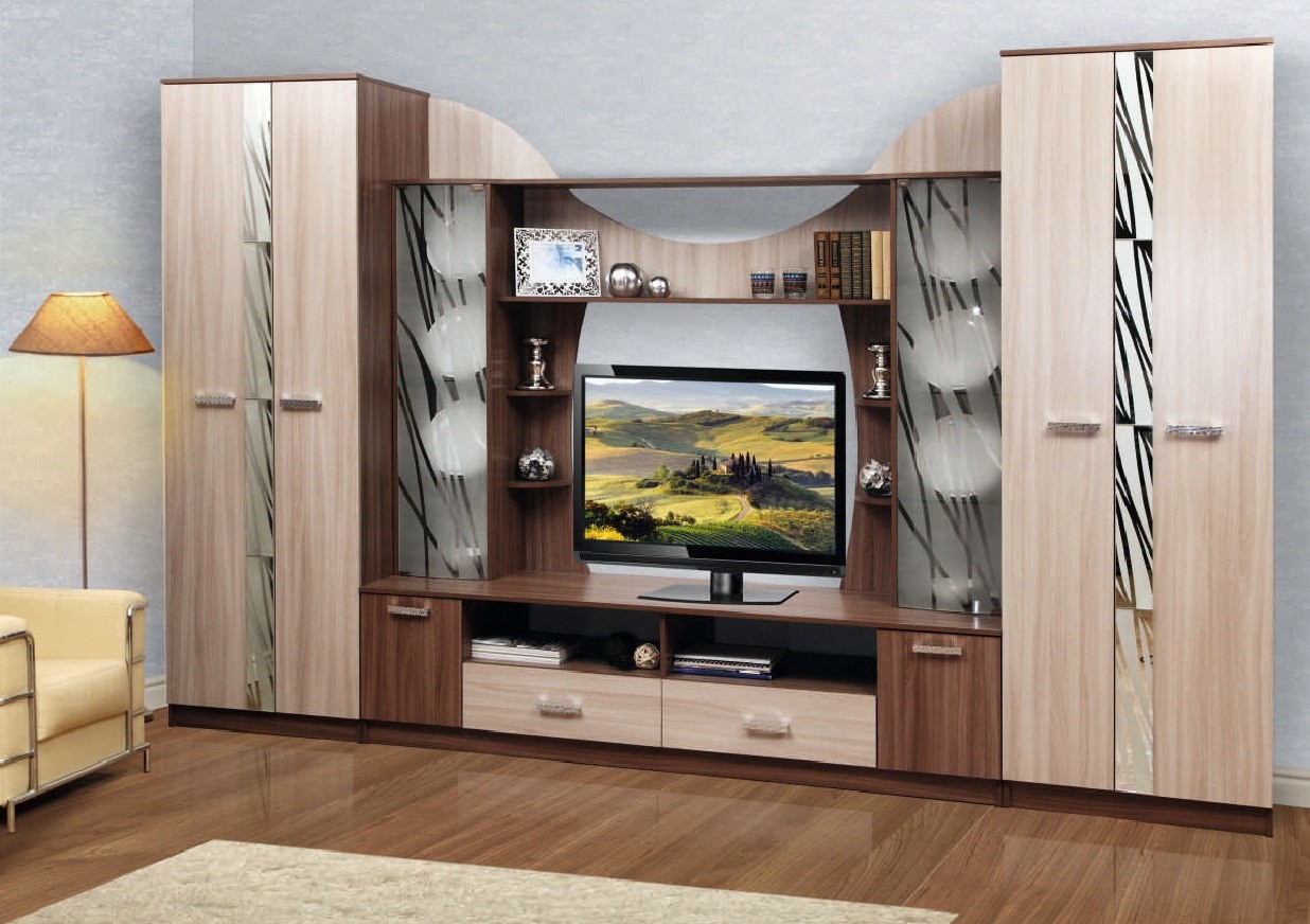Набор мебели Софи (гостиная Софи), представленная мебельным интернет-магазином ДНР "Новая Мебель", – это эффектная мебель, состоящая из двух двустворчатых шкафов и центральной секции. Один из шкафов имеет внутри штангу для вешалок, а другой – вместительные прочные полки. Фасады украшаются нетривиальными вставками, сочетающими контрастные оттенки. В центральном отделе предусмотрены полки, ниши со стеклянными дверцами для красивой посуды, сувениров, выдвижные ящики и небольшие отделы с распашными глухими дверцами. Гостиная устанавливается на цоколь.
