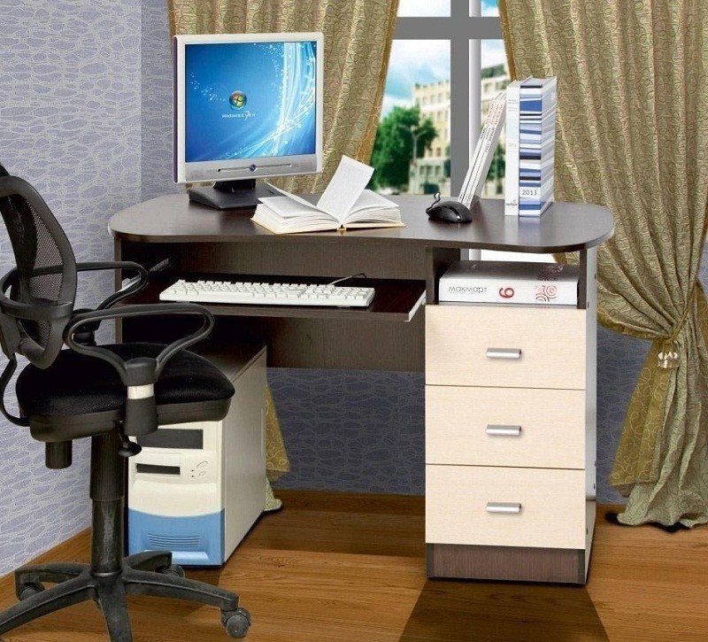 – удобный предмет обстановки, предназначенный для работы и учёбы. Поверхность столешницы имеет овальную форму. Для удобства пользования компьютерной клавиатурой предусмотрена выдвижная полка. Справа расположена секция с тремя выдвижными ящиками и полой нишей. Качественная фурнитура обеспечивает комфортную эксплуатацию изделия. Производитель предлагает два цветовых решения с двумя контрастными оттенками каждое. Оптимальная высота (75 см) обеспечивает удобство размещения за столом.